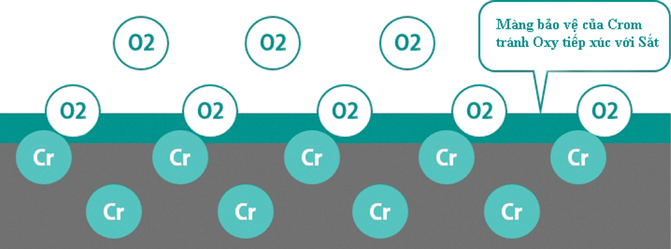 Điều này là do việc bổ sung Crom vào thành phần của thép, Crom là một nguyên tố rất linh hoạt, nó phản ứng với oxy trước khi sắt có cơ hội. Khi nó phản ứng, nó sẽ tạo ra một lớp Crôm Oxit mỏng.